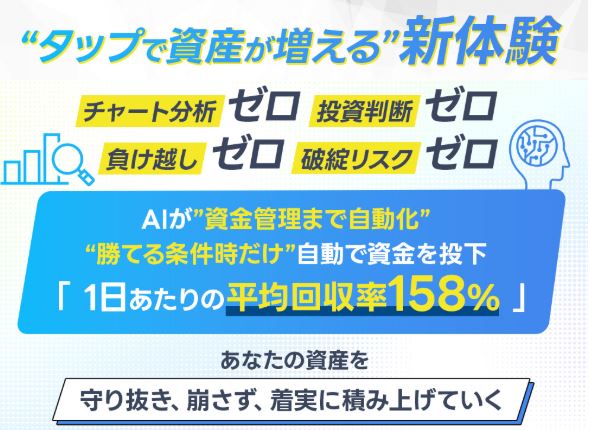防御型AI資産運用システム「ZERO」/ Elegance合同会社では「タップで資産が増える新体」をうたい、勝てる条件時だけ自動で資金を投下することで1日あたりの平均回収率が158%を記録しているということです。