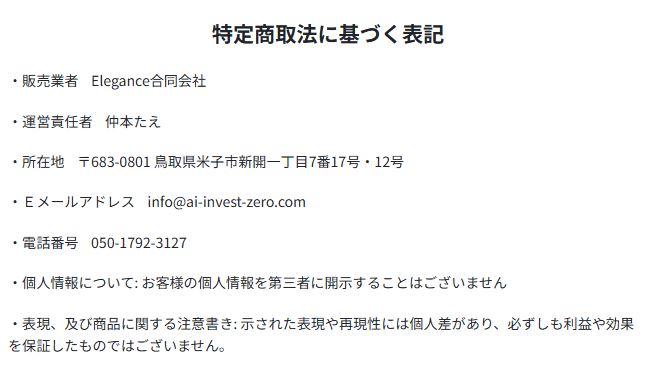 この 防御型AI資産運用システム「ZERO」/ Elegance合同会社のサイトに「特定商取引法に基づく表記」が記載されているので確認しました。