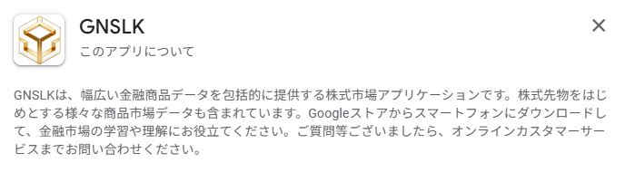 先ほども一部紹介しましたが、GNSLKのアプリの概要は「幅広い金融商品データを包括的に提供する株式市場アプリケーションです。株式先物をはじめとする様々な商品市場データも含まれています。」とあります。