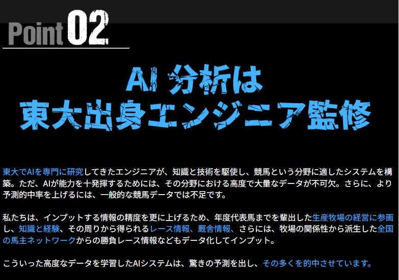予想に使われるAIは東大出身のエンジニアが監修しているといい、年度代表馬までを輩出した生産牧場の経営に参画することで得られる情報をデータ化してAIに読み込ませているということです。
