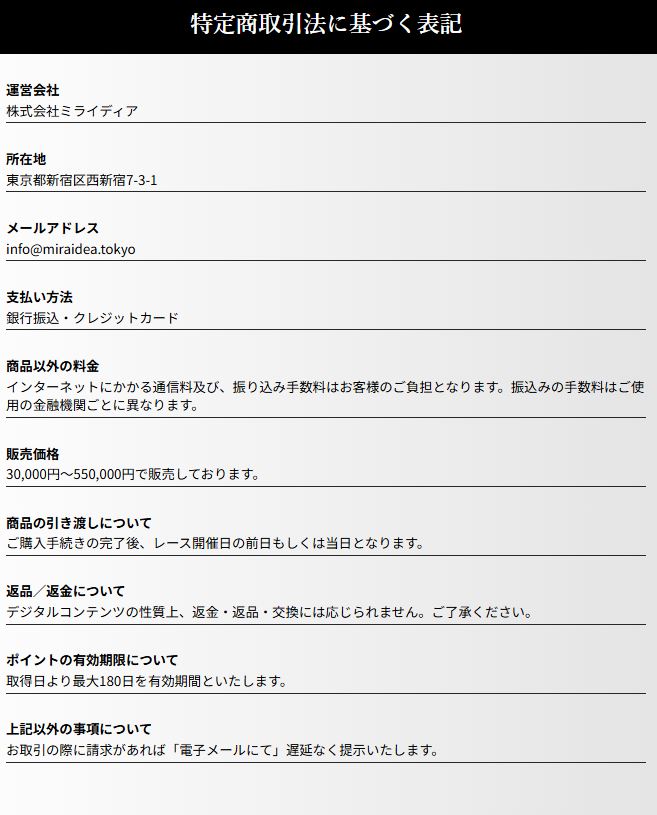 この「株式会社ミライディア」のサイトに「特定商取引法に基づく表記」が記載されているので確認しました。