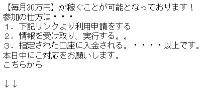 先日、私のメールアドレス宛に「あなたの配当額は【月30万円】です。」という件名のもと、次のようなメッセージが届きました。