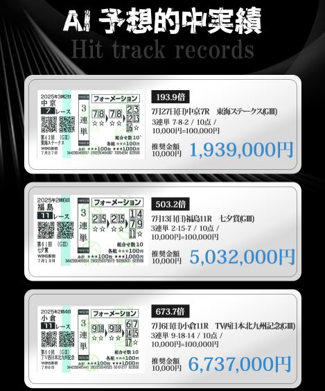 株式会社ミライディアの競馬予想AI情報サイトには、「AI予想的中実績」として過去3レースにおける万馬券の的中具合が紹介されています。